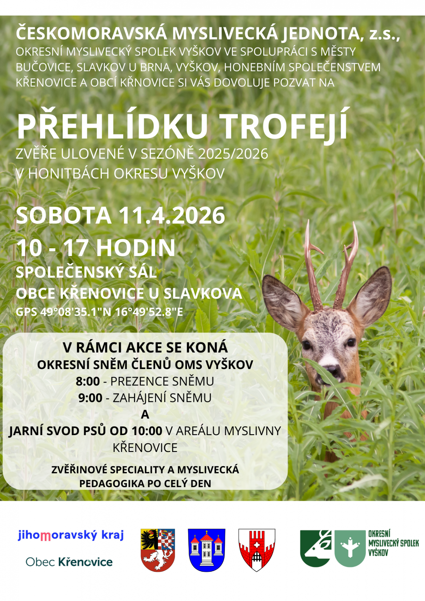 Přehlídka trofejí zvěře ulovené v sezóně 2025/2026 - 11.4.2026 Křenovice