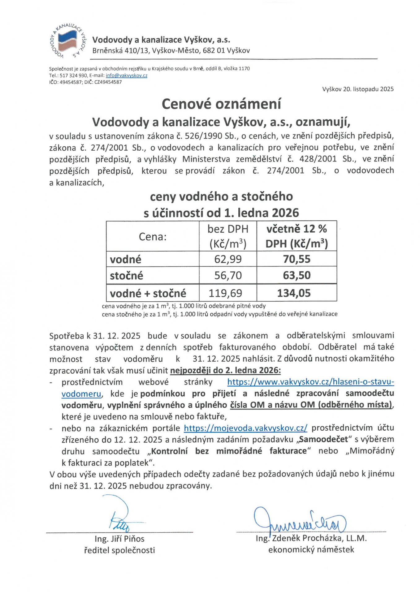 Vodovody a kanalizace Vyškov, a.s. - cenové oznámení na rok 2026