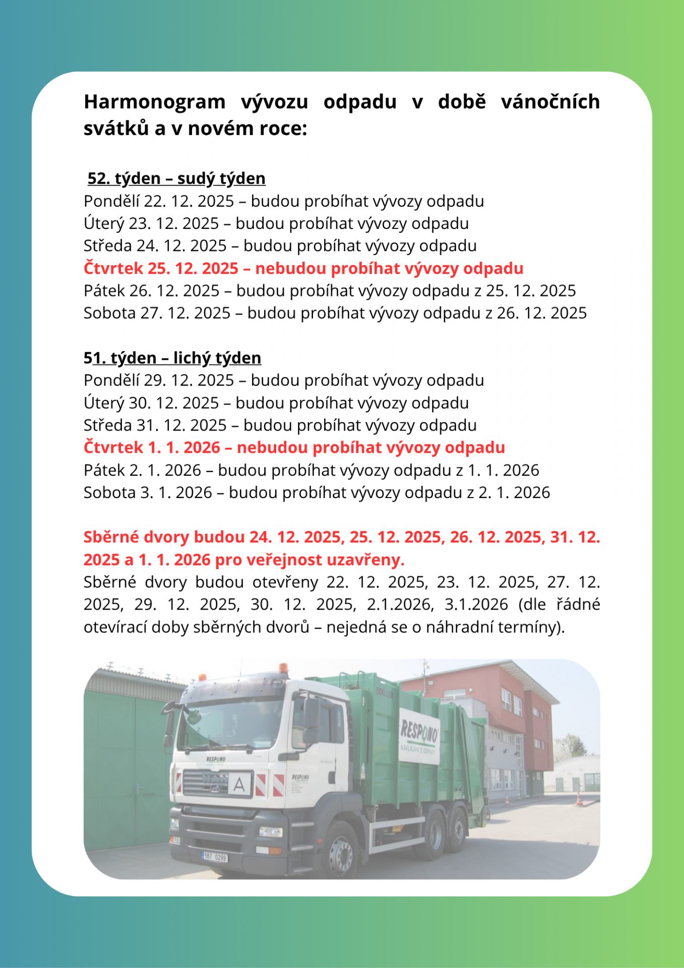 RESPONO - Harmonogram vývozu odpadu v době vánočních svátků a v novém roce