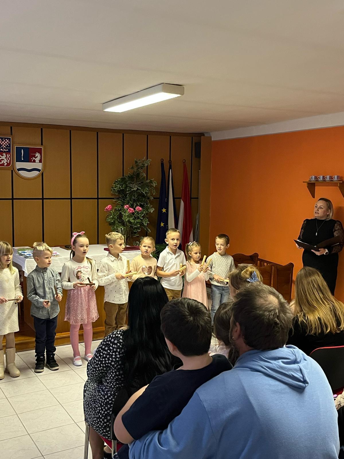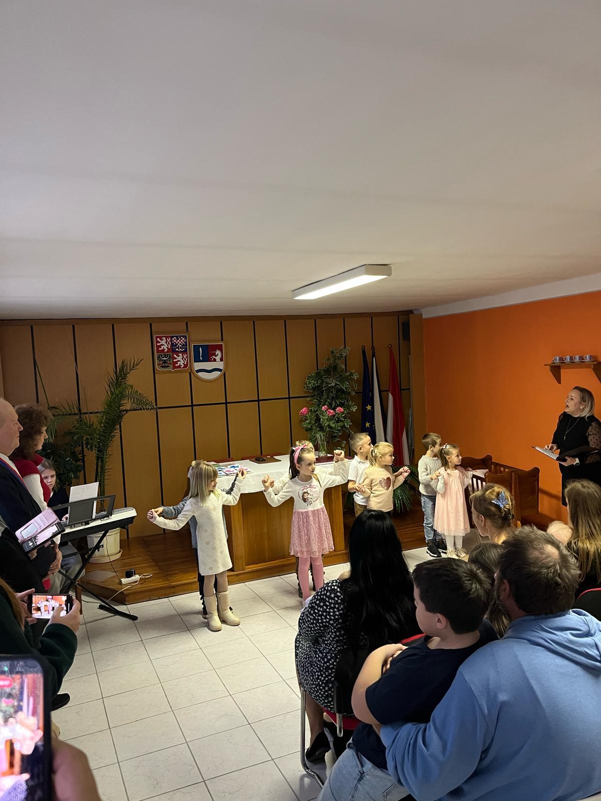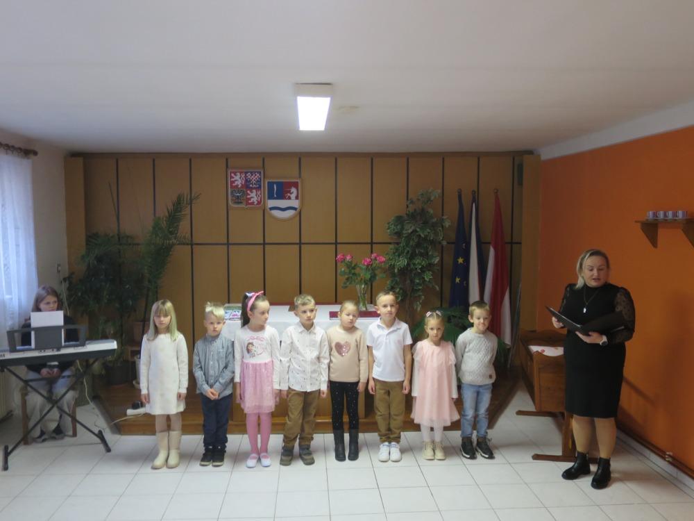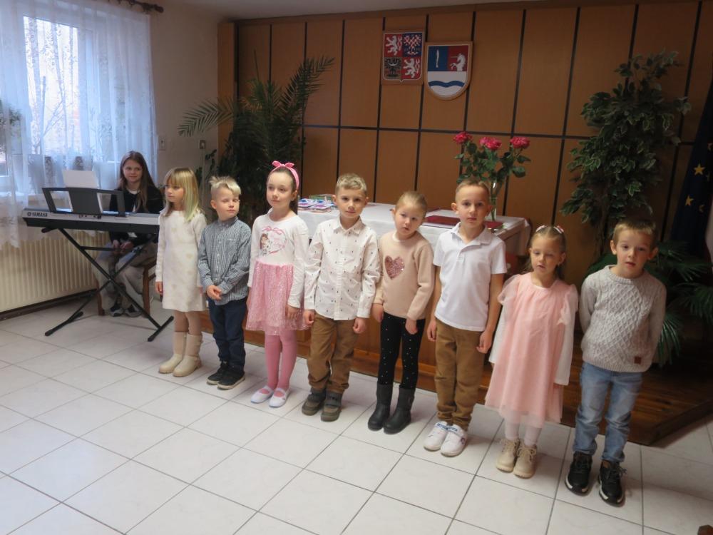 Pak následovalo velmi milé a povedené vystoupení dětí z MŠ, které přednesly pásmo básniček a písniček. Výstup dětí byl úžasný. Po skončení programu děti z MŠ předaly občánkům dárek, který pro ně sami vytvořily. Následně paní Eva Matušů představila panu místostarostovi nové občánky naší obce.